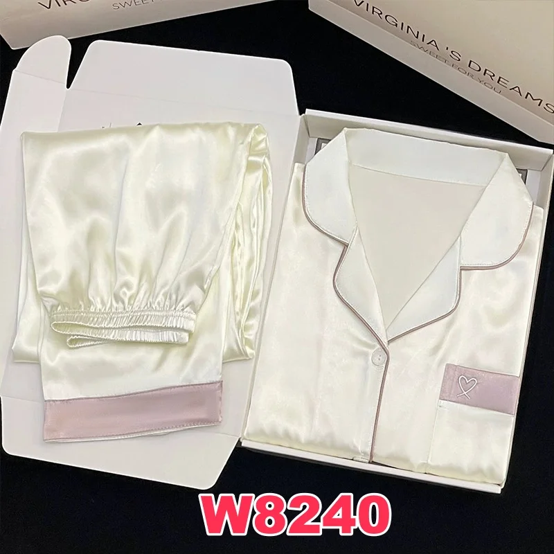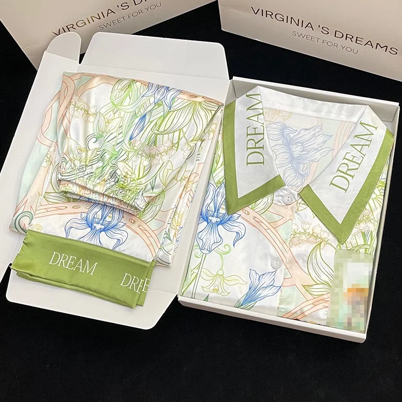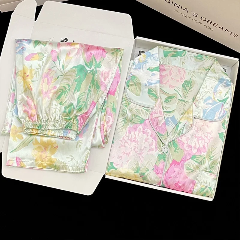 Women Smooth Satin Pajamas Set Long Sleeve Shirt + Wide Leg Pants Two Piece Suit Spring Autumn Lady Casual Printed Pajamas